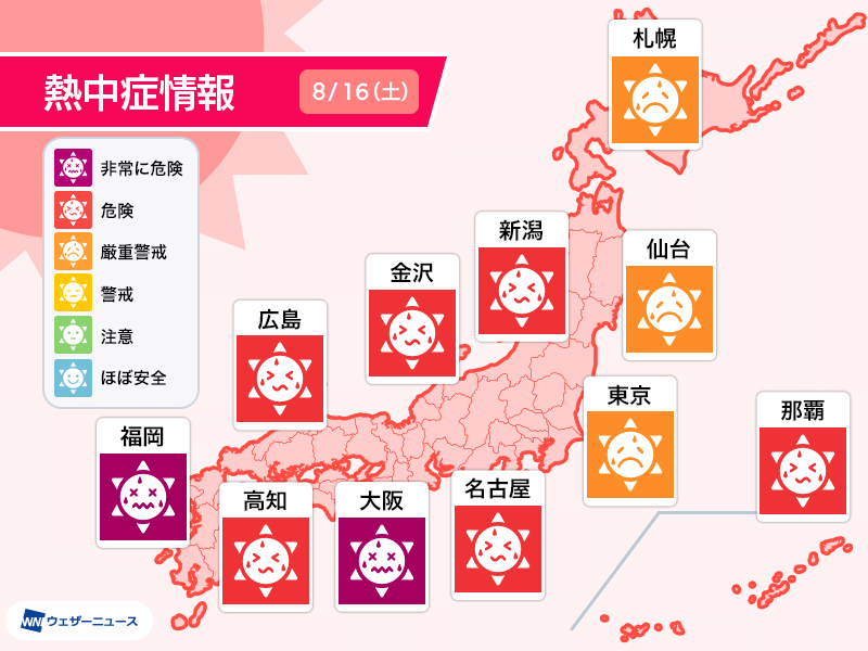雲が広がる分だけ気温の上昇は抑えられ、35℃以上の猛暑日の所は少ない予想となっています。