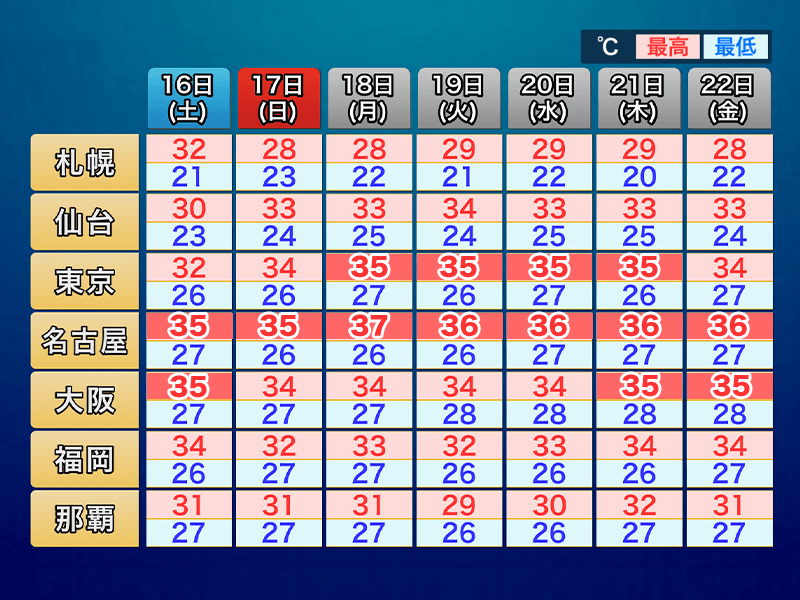 晴れて強い日差しが照りつけることで気温が上がり、一部では35℃以上の猛暑日が予想されます。特に東海や近畿で暑さが厳しく、名古屋市は明日16日(土)から22日(金)まで猛暑日が続く見込みです。