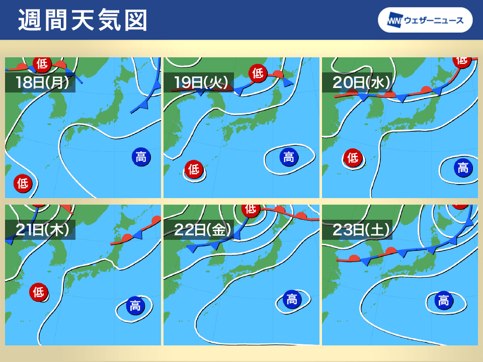 来週にかけても太平洋高気圧の勢力が強く、前線は不明瞭となります。西日本から東日本では晴天が続くとみられます。