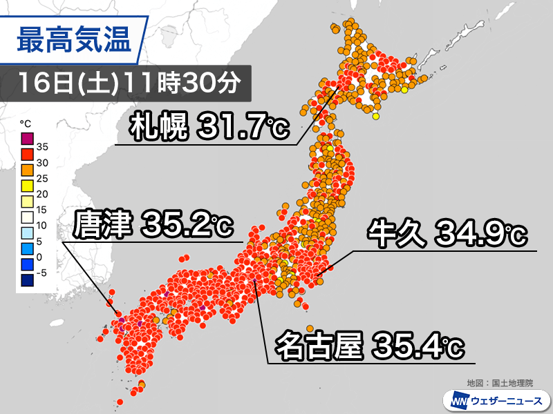 11時30分までの最高気温は名古屋市で35.4℃、佐賀県唐津市で35.2℃、島根県津和野町で35.0℃を観測し、すでに猛暑日になっています。関東は雲が多い分、昨日よりはやや気温の上昇が抑えられているものの、千葉県市原市・牛久で34.9℃まで上がるなど、日差しが届いている所ではかなりの暑さです。