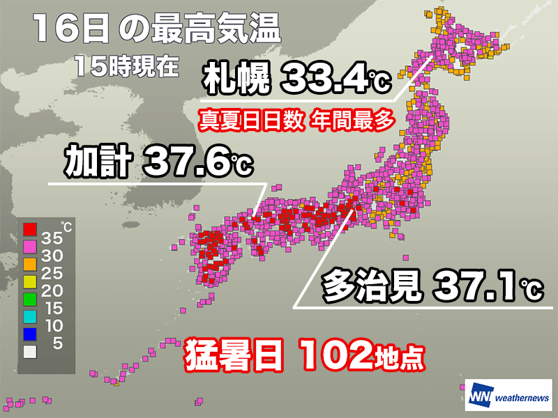 今日16日(土)に全国で最も気温が上がったのは広島県安芸太田町・加計で37.6℃、次いで大分県日田市で37.5℃、岐阜県多治見市で37.1℃を観測。体温並みの暑さです。そのほか。名古屋市で37.0℃、京都市で36.9℃まで上がっています。