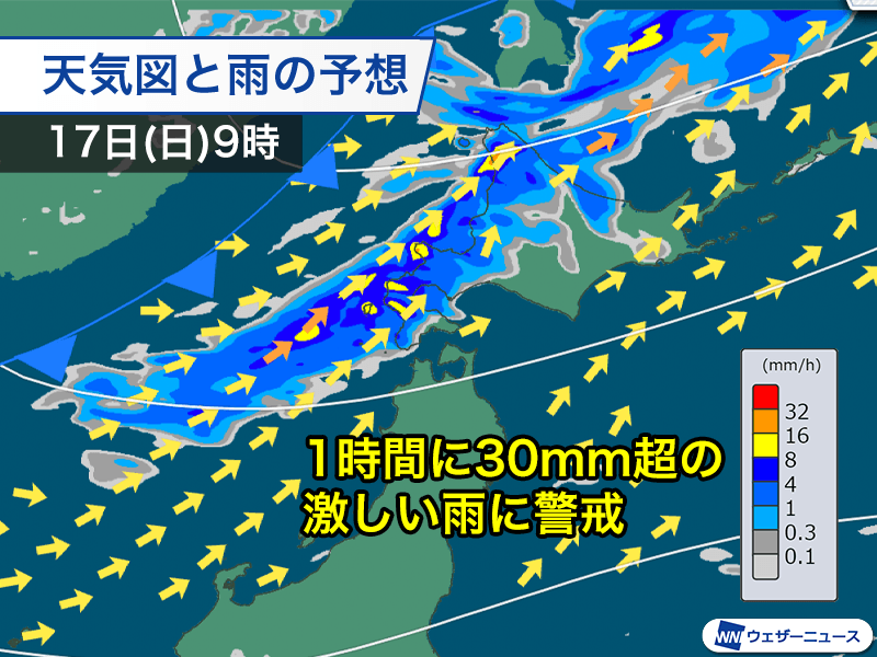 午前中は北海道日本海側、午後は東北北部の日本海側で雨が強まりやすくなります。1時間に30mm以上の激しい雨の降る所があり、局地的には50mm以上の非常に激しい雨が降ってもおかしくありません。