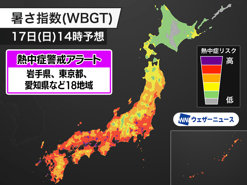 明日8月17日(日)の熱中症警戒アラート 東北から西日本の18地域に発表 東京は10日ぶり