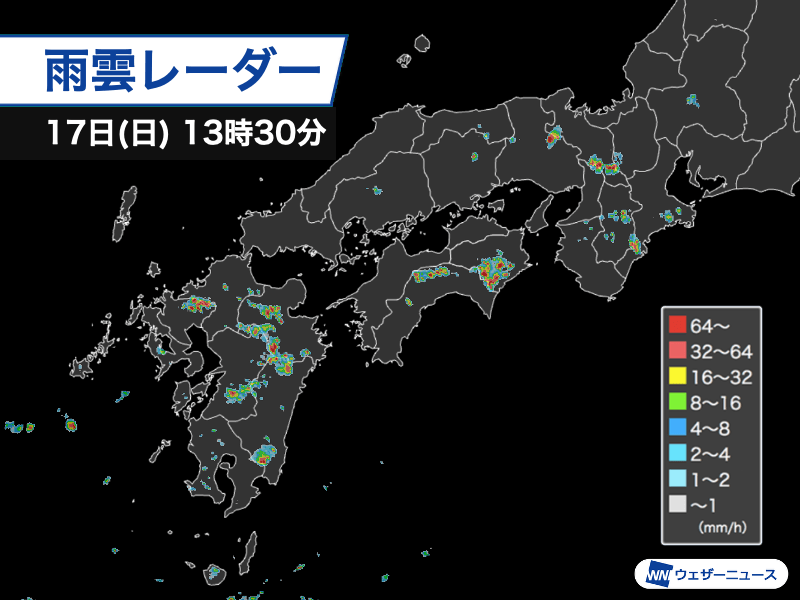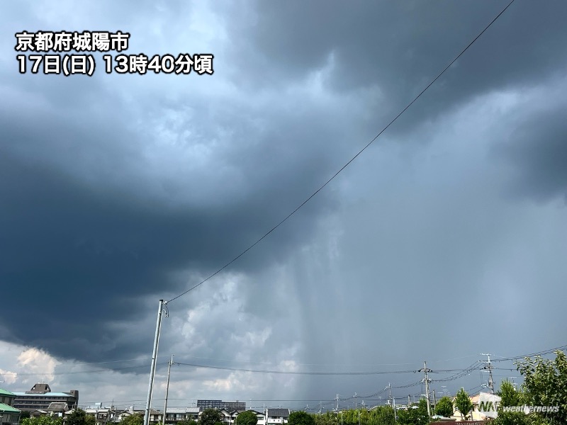 京都府長岡京市では、13時30分〜40分の10分間で6.0mm(1時間降り続いたと仮定すると30mm超)の激しい雨を観測しました。また、先ほど宇治市には大雨警報が発表されています。日が暮れる頃までは急な強い雨に警戒が必要です。