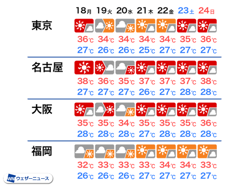 明日18日(月)からの一週間も、関東から西日本を中心とした広い範囲で最高気温は35℃前後になるとみられます。特に東海や近畿で気温が高く、名古屋市は一週間連続の猛暑日予想。明日や24日(日)は最高気温が38℃と、体温を上回る危険な暑さになる見込みです。