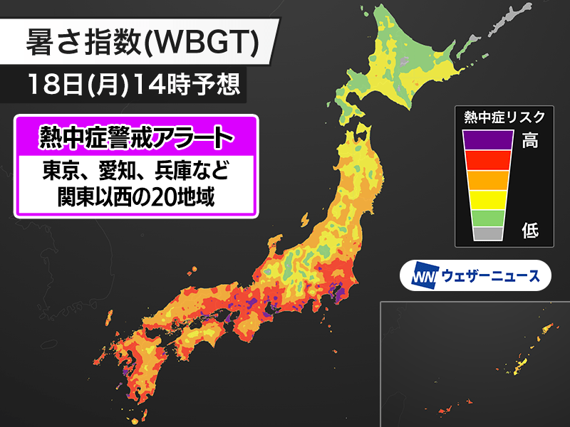 明日8月18日(月)の熱中症警戒アラート 関東から西日本の20地域に発表