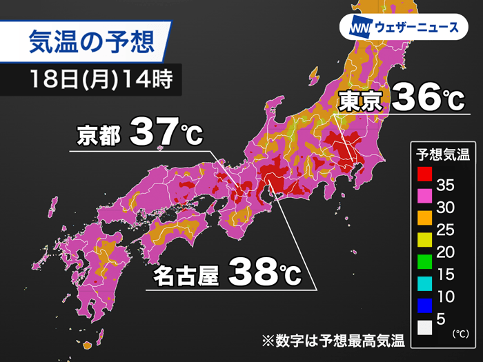 各地の予想最高気温は、前橋市や甲府市、名古屋市などで38℃まで上がると見込みです。体温を超えるような危険な暑さになります。その他、さいたま市や京都市で37℃、東京都心や大阪市でも36℃と猛暑日になる予想です。