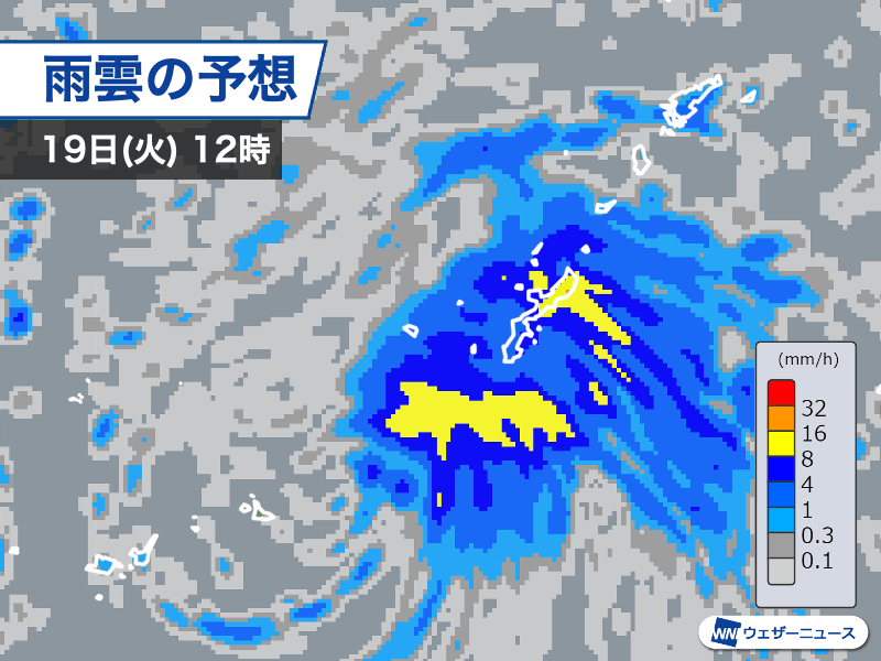午後は沖縄本島や奄美を中心に風がやや強まり、高波やうねりにも注意が必要です。深夜以降は熱帯低気圧本体の活発な雨雲がかかり始めるとみています。