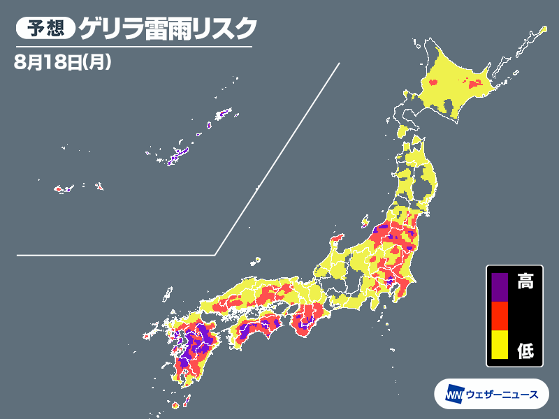 西日本と関東付近でゲリラ雷雨リスクが高い