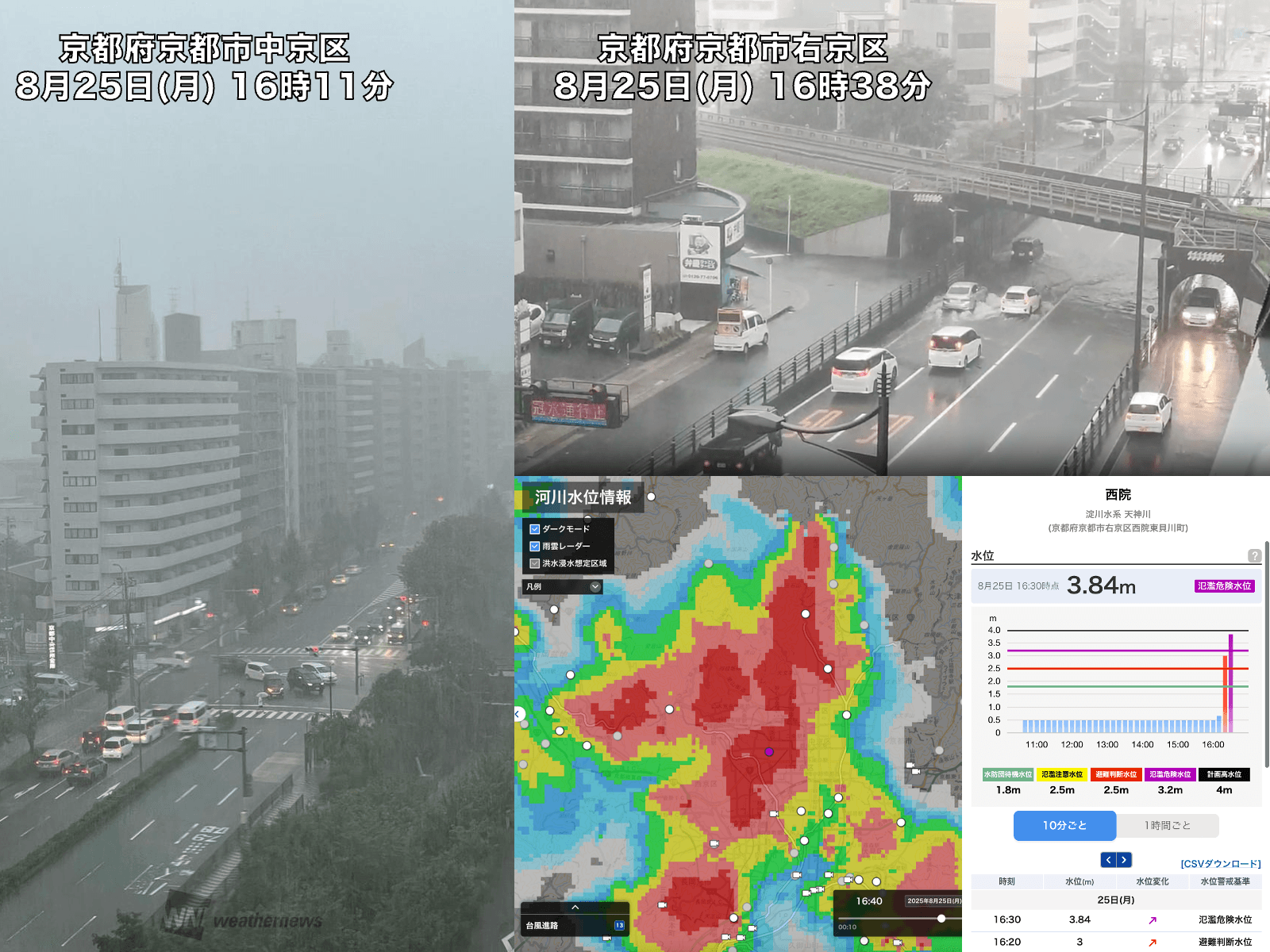 25日(月)は、西日本を中心にゲリラ雷雨が発生。山沿いで発生したものが大半でしたが、京都市でも雷雲が発生し、視界が霞むほどの激しい雨が降り続きました。京都市では16時50分までの1時間に、102mmの猛烈な雨を観測。1時間雨量としては観測史上最大となり、気象庁の「記録的短時間大雨情報」も発表されました。