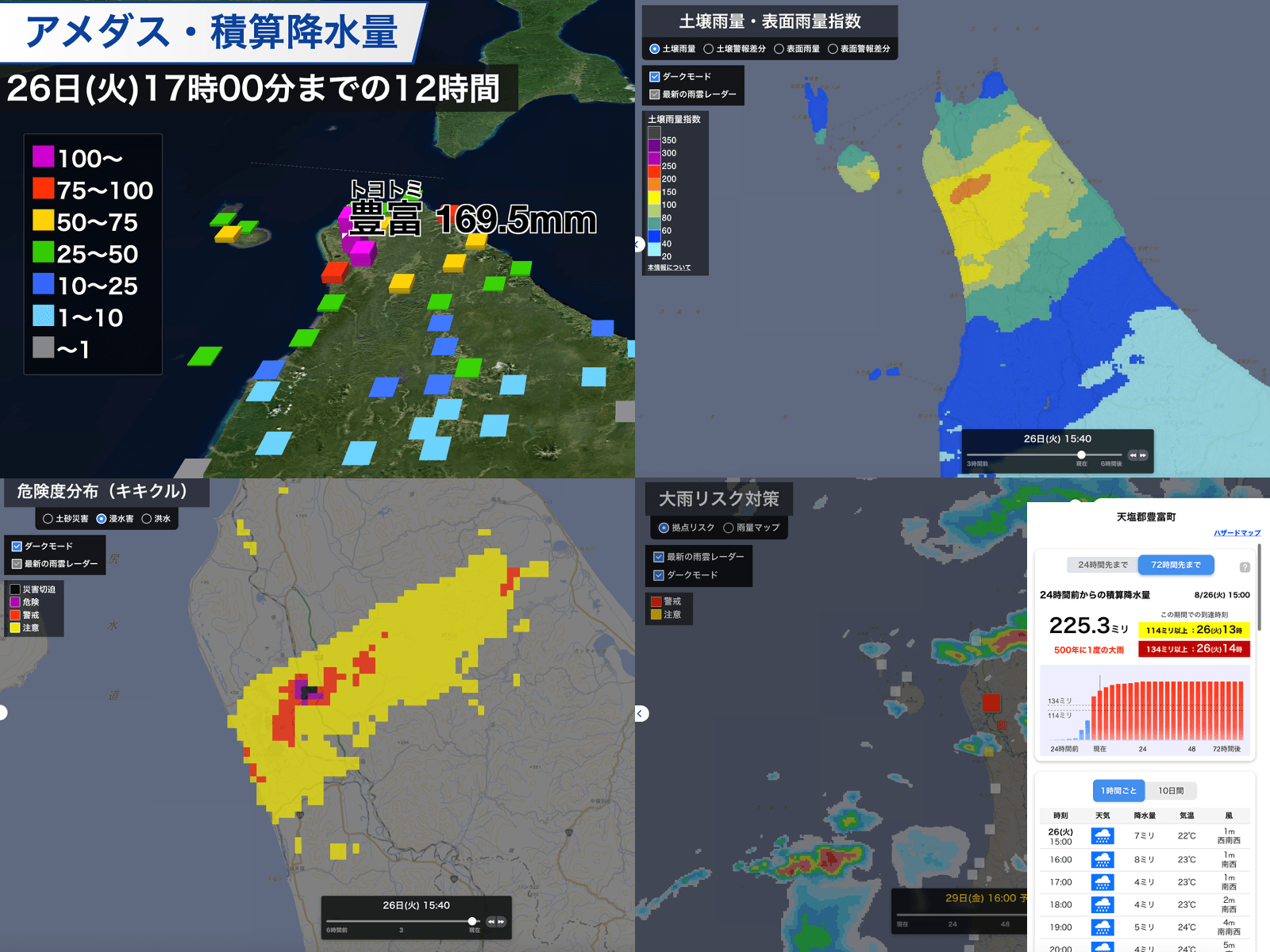 低気圧に近い道北、特に宗谷地方の日本海側では26日の午前中から雨が強まりました。豊富町では、同日17時までの12時間雨量で169.5mmを観測。これは、平年の8月1ヶ月分の雨量(120.9mm)を大きく超える量となりました。町内では道路の冠水や農地の浸水が報告されたほか、交通網にも影響が出ました。