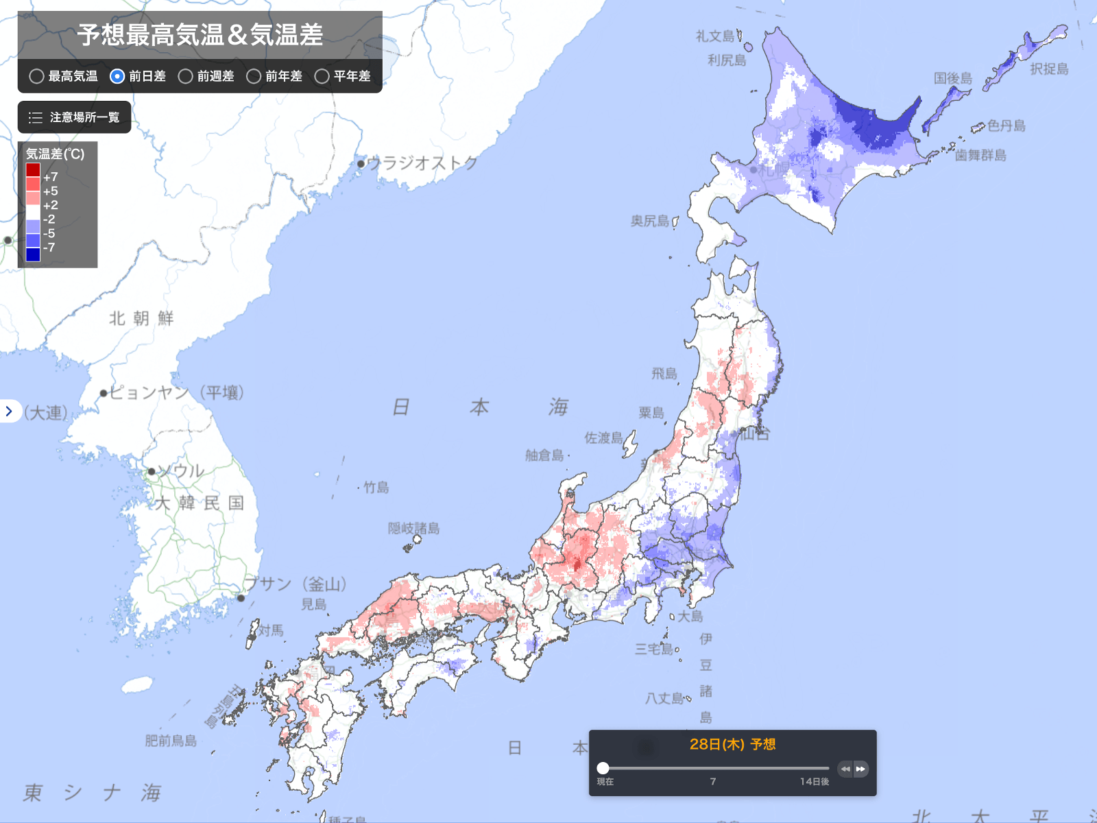 今後は、関東以西でも前線や低気圧の影響を受ける日が増える予想です。天気が周期変化するようになり、それにつれて、日ごとの気温差も大きくなります。「予想最高気温・気温差」コンテンツでは、最高気温の平年差や、前の週・前年の同じ週との差など、日ごとの気温の変化を把握することができます。気温の変化から秋の気配を汲み取って、秋物商品や温かい食べ物・飲み物の準備など、秋支度を計画的に進めていきましょう。