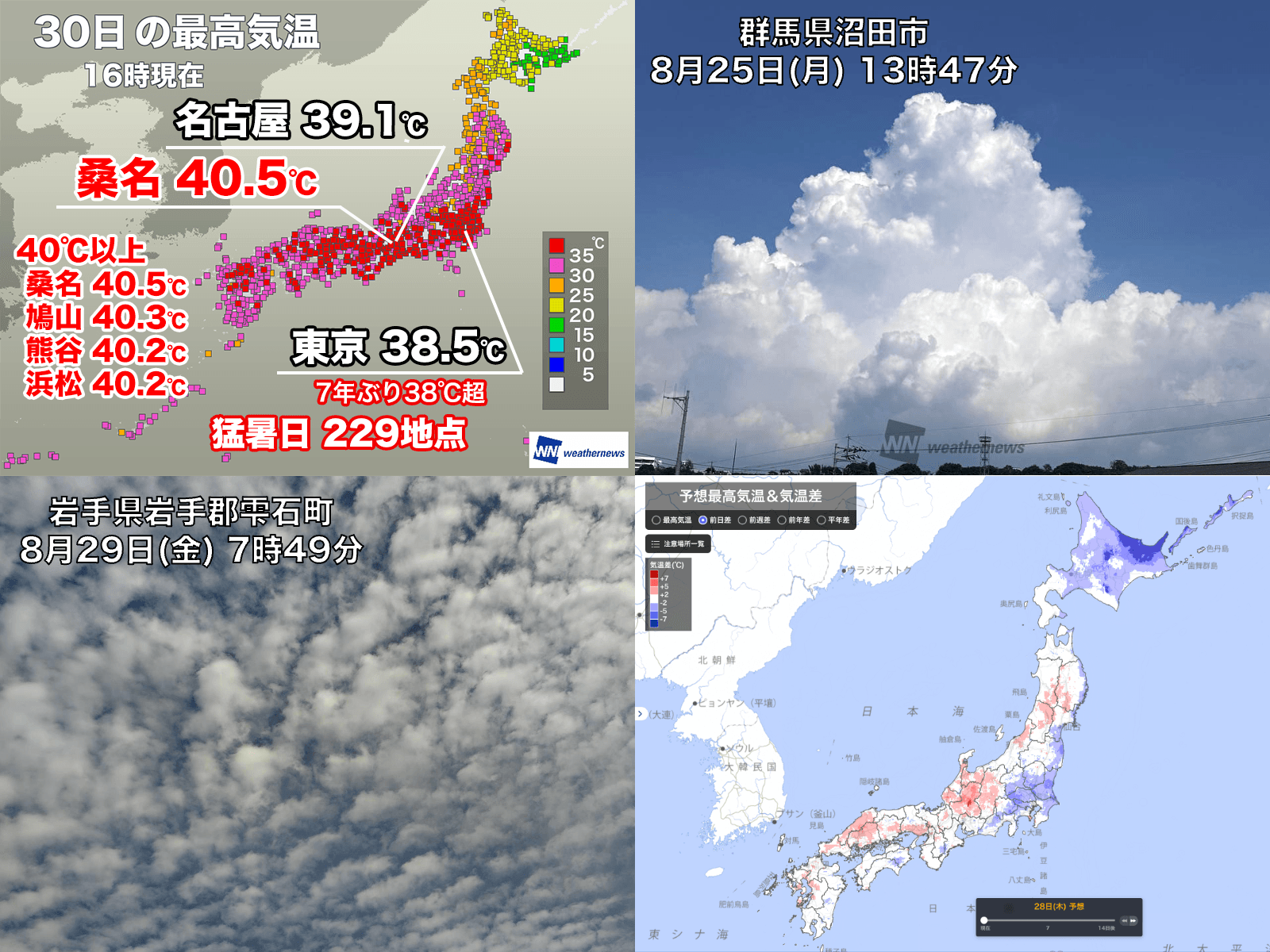 週末はさらに気温が上昇しました。30日(土)には、三重県桑名市での最高気温40.5℃をはじめ、全国4地点で40℃以上を観測。翌31日(日)にも名古屋市で今年最高の40.0℃を観測するなど、関東以西で猛烈な残暑となりました。