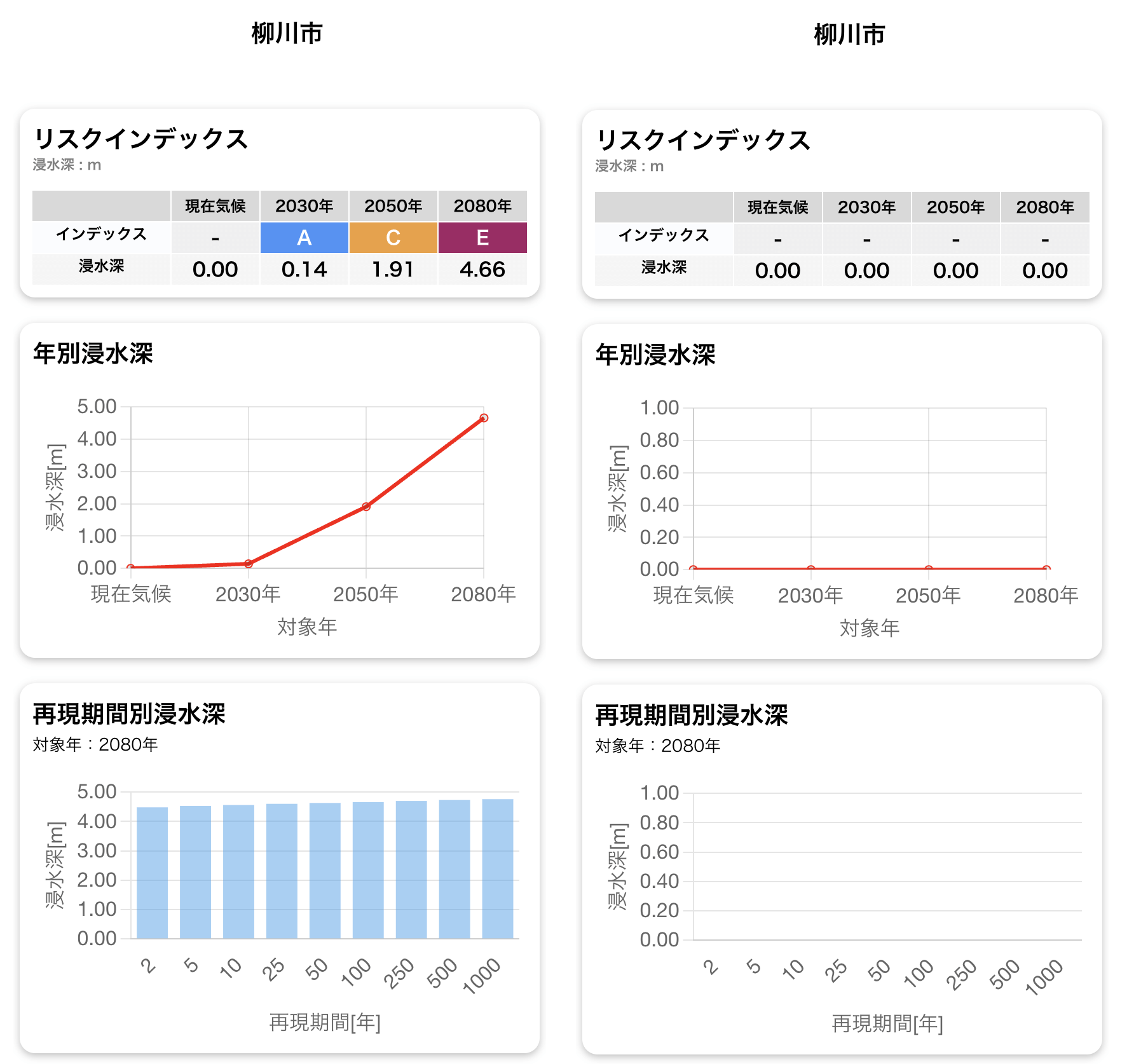 『地盤沈下あり』では2080年にかけてリスク増加(浸水深が増加)していきますが、『地盤沈下なし』では2080年にかけてリスクなし(浸水深なし)で一貫しています。