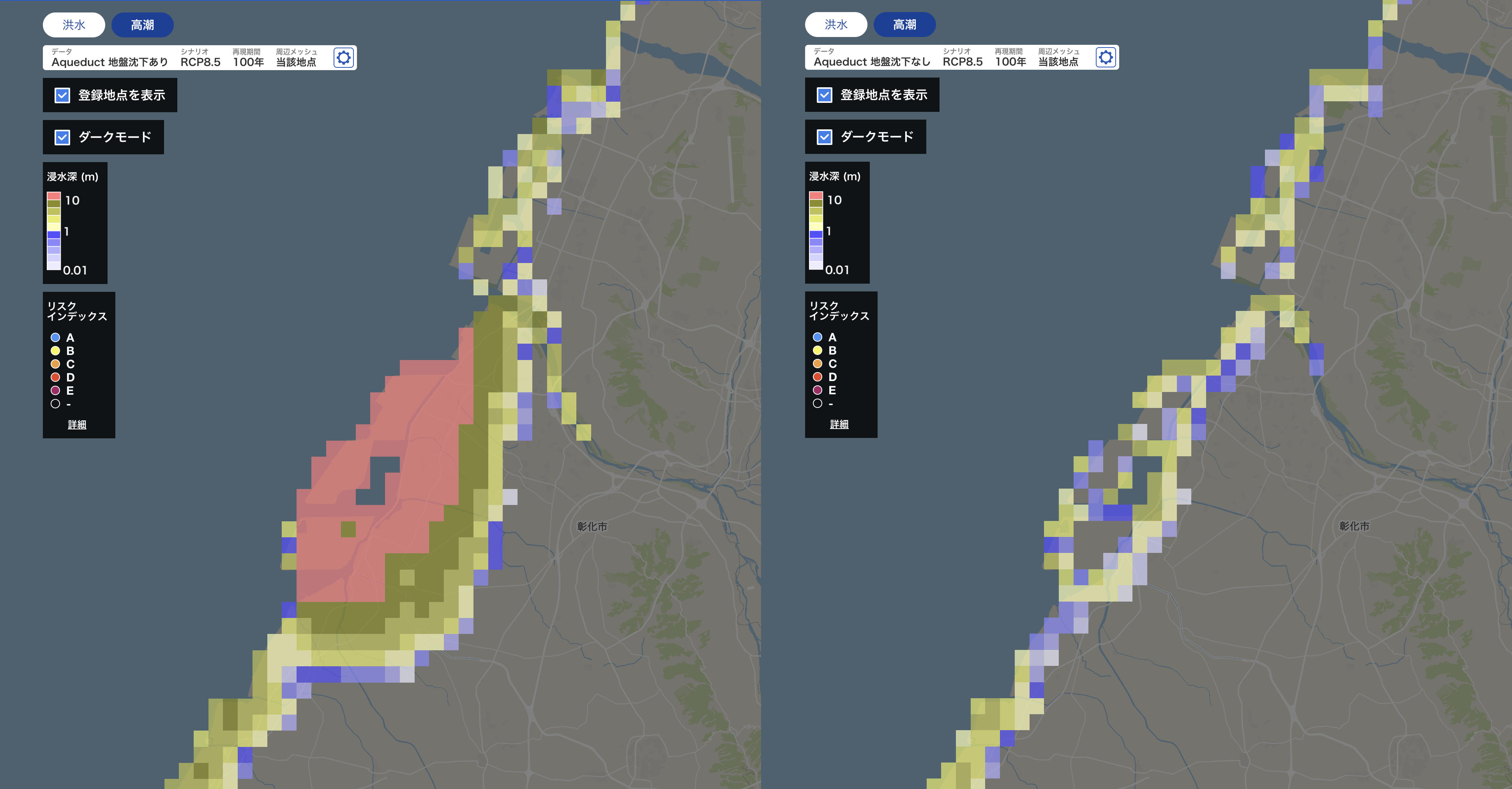 図の左側は地盤沈下あり、右側は地盤沈下なしの場合の結果です。(シナリオはRCP8.5、再現期間100年確率)