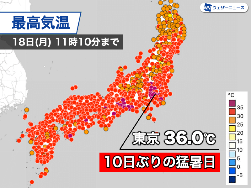 東京都心は10時34分に35℃を突破し、8日(金)以来10日ぶりに猛暑日になりました。11時10分現在、全国で最も気温が高いのは東京都府中市で、36.9℃となっています。