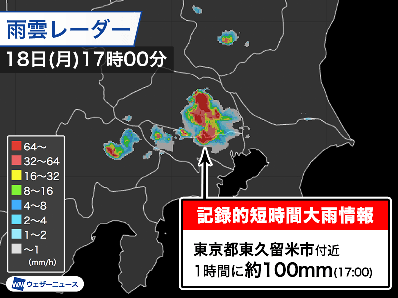 東京都で1時間に約100mmの猛烈な雨 記録的短時間大雨情報