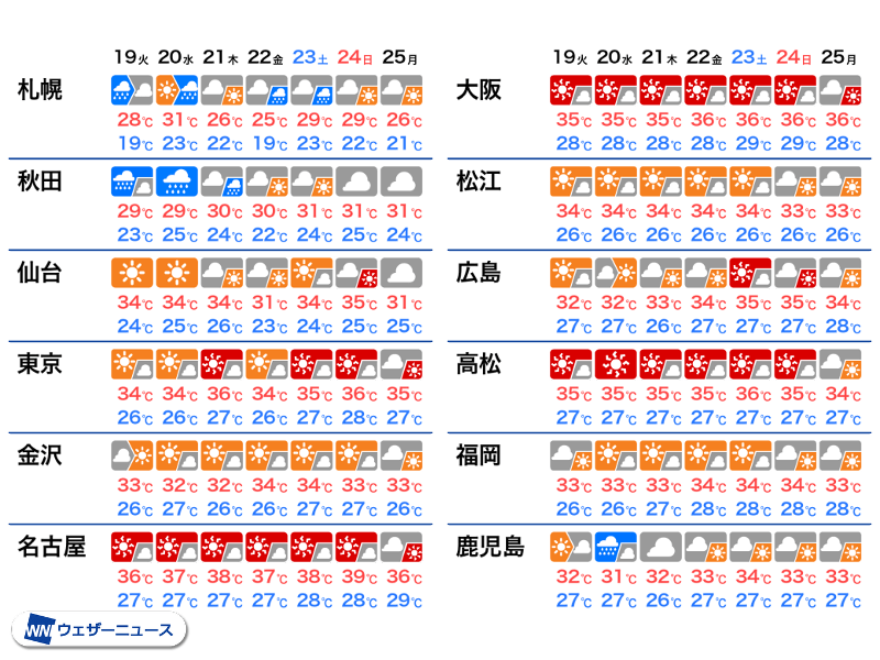 東京都心も35℃前後の日が続き、猛暑日になる日がある見込みです。暑さのピークは週末の予想で、東北でも仙台などで猛暑日になる可能性があることから、気象庁は東北太平洋側から関東甲信、東海、西日本、沖縄・奄美に高温に関する早期天候情報を発表しました。