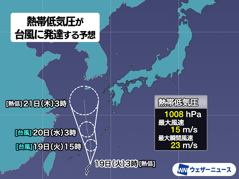気象庁の台風予報では、熱帯低気圧は発達して台風に変わり、今日19日(火)に沖縄本島の西を通過する見通しです。