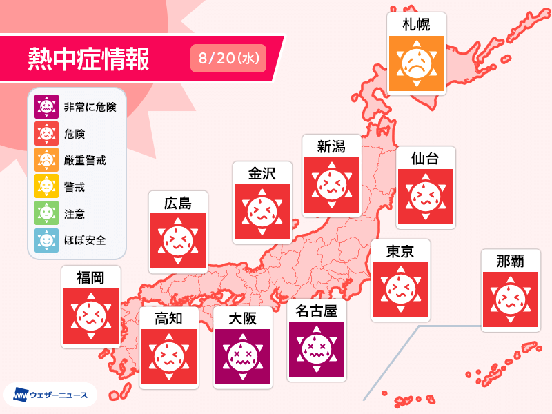 太平洋高気圧の圏内となる西日本や東日本では広く日差しが届き、昼間は深刻な残暑が続きます。体温に近い高温となる地点もあり、引き続き熱中症に最大限の警戒が必要です。