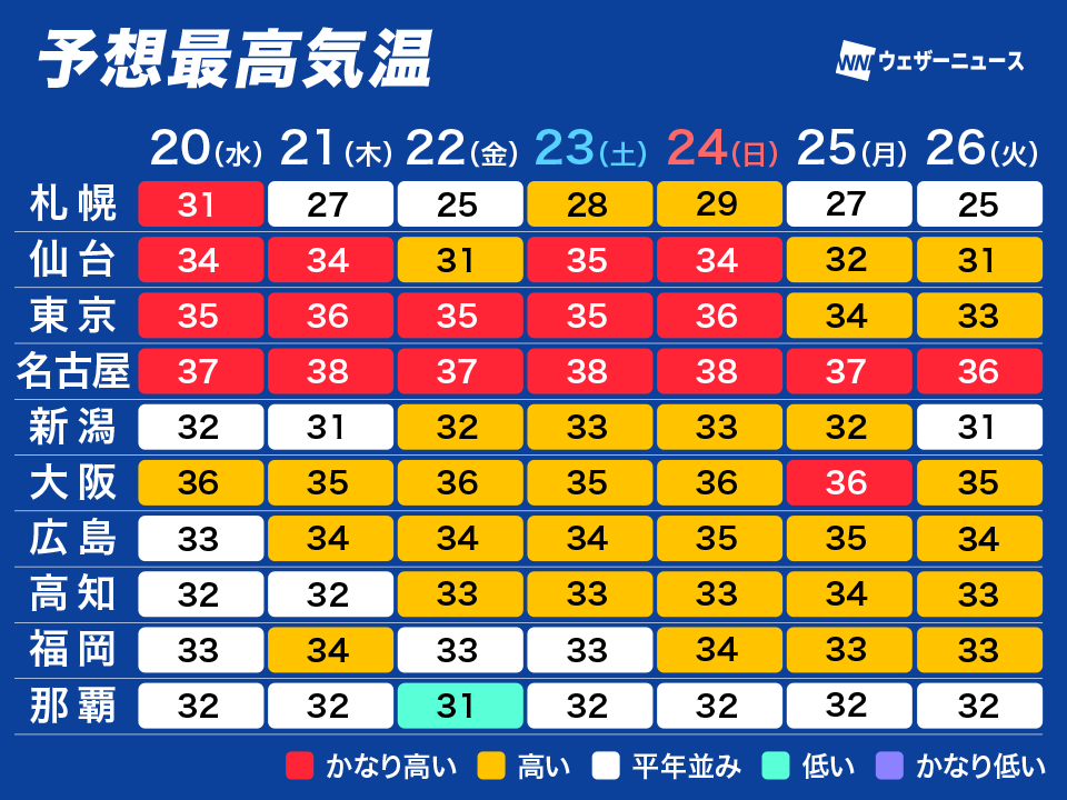 熱中症にかかるリスクが高い状態が続きます。在宅勤務など、屋外で過ごす時間をなるべく少なくする方法をご検討ください。止むを得ず屋外で長時間過ごす場合はこまめな水分補給と休憩が欠かせません。屋内で過ごす場合も冷房を活用するようにしてください。