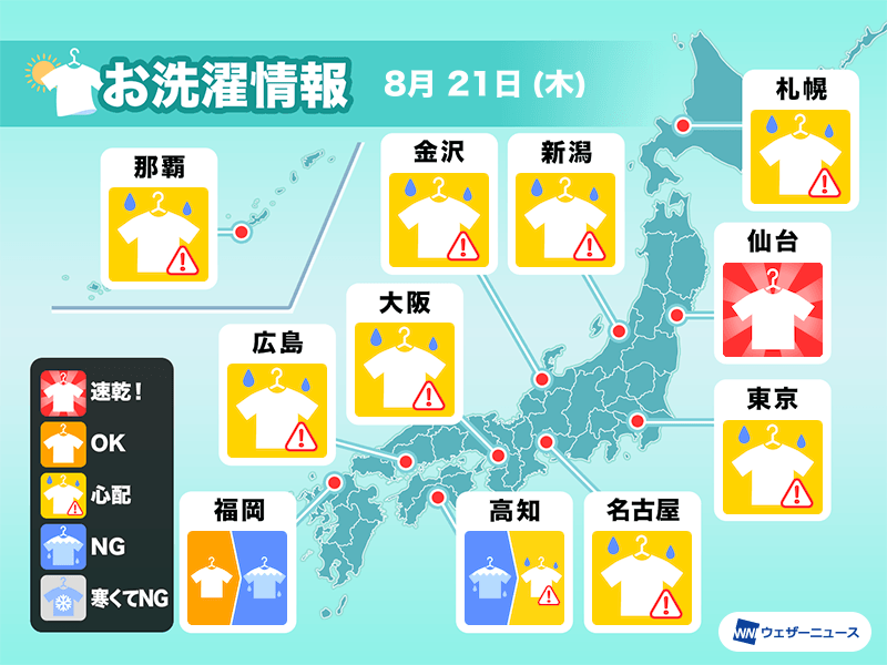 関東や東海、近畿、中国四国では午後は天気急変の可能性があります。午前中のうちに洗濯物は片付けて、早めに取り込むのがおすすめです。