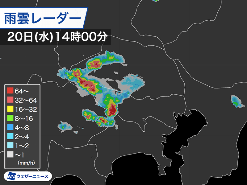 東風と南風が衝突して、12時頃から東京多摩から埼玉県秩父にかけての地域で雨雲が急発生しました。雨雲は急速に発達しながら上空の風に乗って東に移動し、東京都青梅市や埼玉県飯能市に雨を降らせています。