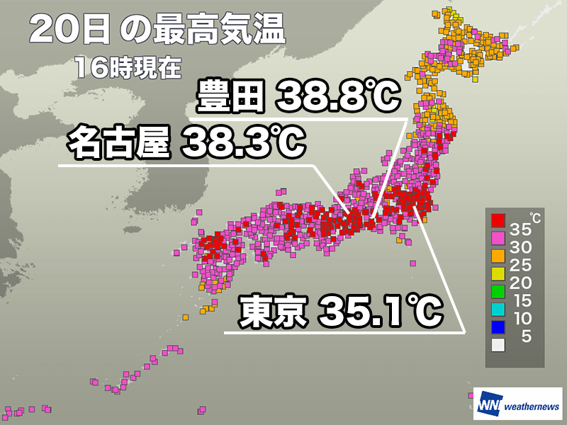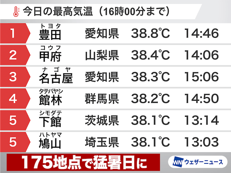 最も高い最高気温は愛知県豊田の38.8℃。甲府(38.4℃)や名古屋(38.3℃)、前橋(38.0℃)も体温を大きく上回る危険な暑さとなりました。東京も35.1℃を観測して3日連続の猛暑日です。