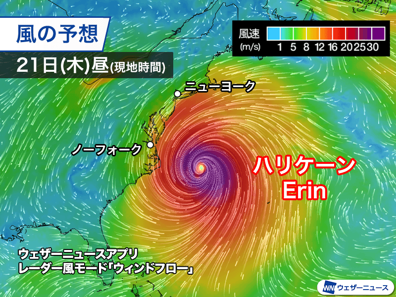ハリケーンErinは北寄りに進路を変えて、アメリカの東の海上を進んでいます。現地時間20日(水)夕方(日本時間21日朝)の時点で、中心気圧は943hPa、中心付近の最大風速は50m/sで、カテゴリー2の勢力です。
