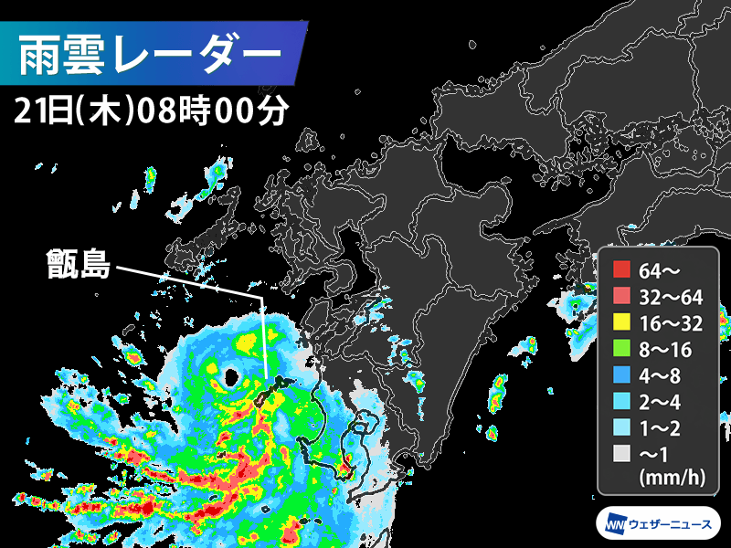 また風も強まっています。現時点までに、中甑では早朝に16.5m/s、鹿児島県枕崎市で未明に17.6m/s、長崎県の雲仙岳でも16.4m/sの最大瞬間風速を観測しています。