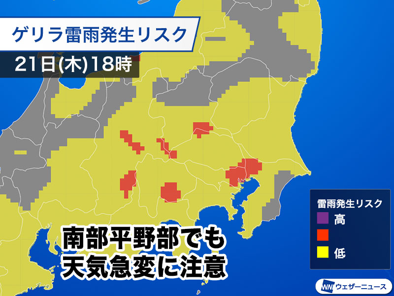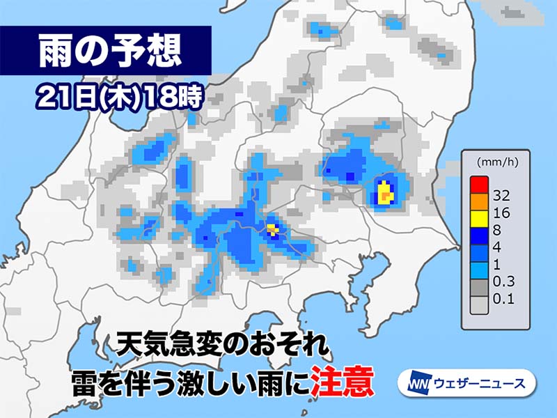 今日21日(木)の関東甲信地方は、気温の上昇に伴い大気の状態が不安定になる見込みです。