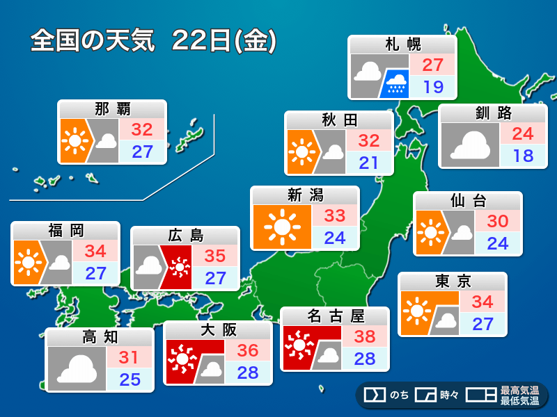 明日の予想最高気温は、東京34℃、名古屋38℃、大阪36℃、広島35℃、高松35℃です。関東から中国・四国にかけては35℃以上となる所が多い見込みです。