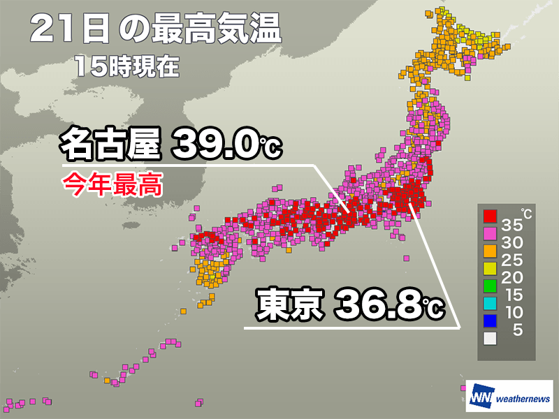 今日21日(木)15時までの最高気温は、東京36.8℃、名古屋39.0℃、大阪36.9℃、福岡35.8℃となっています。