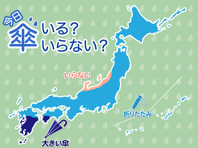 広範囲で天気が変わりやすく、急な強い雨や雷雨の可能性があります。家を出る時に雨が降っていなくても外出には折りたたみ傘をお持ちください。日差しが強いので晴雨兼用の傘が重宝しそうです。