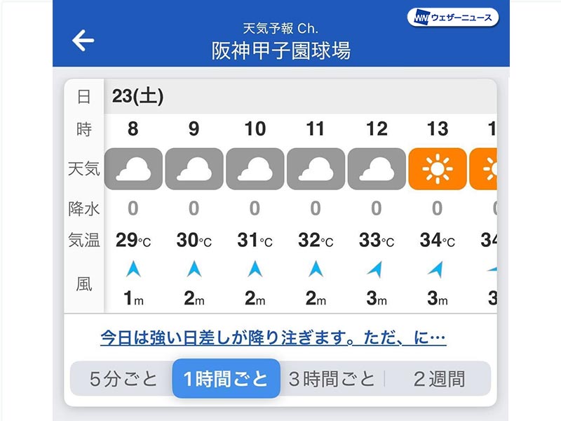 明日は、雲が多めながらも日差しが届きます。日差しでどんどん気温が上がり、試合終盤には33℃前後の厳しい暑さとなる予想です。