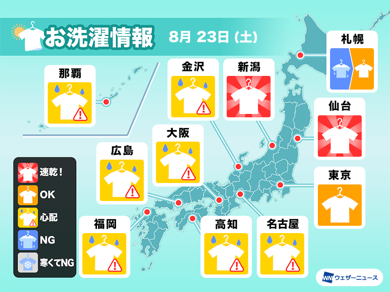 東日本や東北南部、沖縄は強い日差しが照り付けて、外干ししたらカラッと乾いてくれそうです。内陸や山沿いでは午後からにわか雨の可能性があるので、乾いたら早めに取り込むようにしてください。