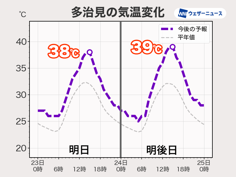 岐阜県多治見市の最高気温は39℃の予想で、40℃に迫ってもおかしくありません。関東でも埼玉県熊谷市や群馬県伊勢崎市などで38℃を予想し、明日と同じかそれ以上の暑さです。