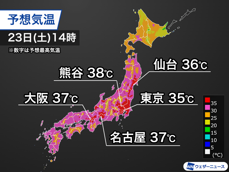近畿から東海、関東にかけては明日23日(土)も厳しい暑さが続きます。特に関東平野や濃尾平野は広い範囲に35℃以上の赤い領域が広がっていて、気温が上がる見込みです。
