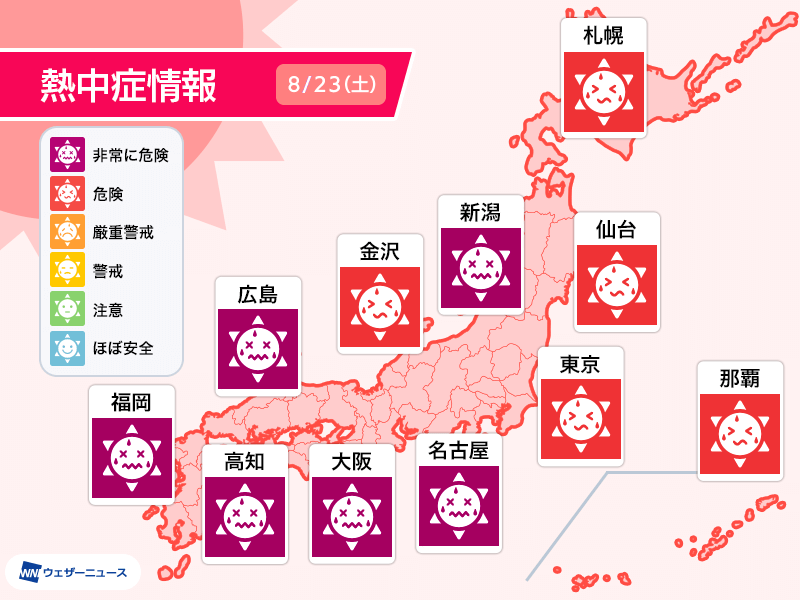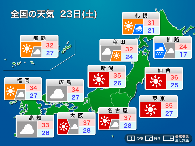 明日8月23日(土)の天気予報 関東、東海など危険な暑さ 北海道は朝まで雨