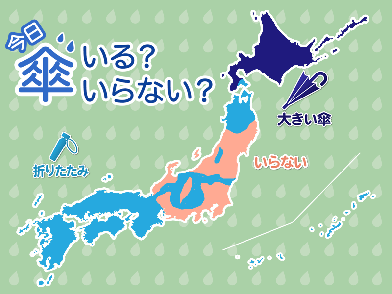 九州や中国・四国は熱帯低気圧の影響で、東日本の山沿いや近畿、南西諸島は大気の状態が不安定なため急な雨に要注意。お出かけの際は折りたたみ傘があると良さそうです。