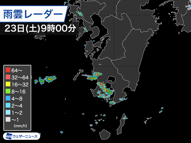 薩摩川内市に設置されているアメダス八重山では早朝に1時間に63mm(05:40まで)の非常に激しい雨を観測。鹿児島のアメダスでも1時間に38mm(07:30まで)の激しい雨を観測しました。