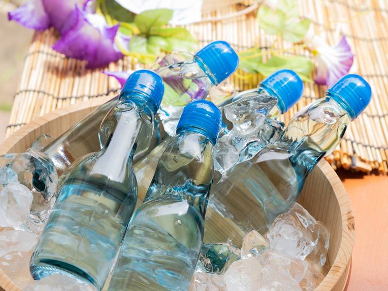 ラムネは炭酸水に甘味料や香料などを加えた清涼飲料水。ガラス玉で瓶に栓をしているのが大きな特徴です。