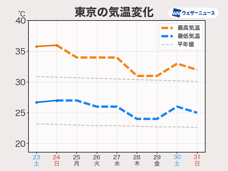 昨日から二十四節気の「処暑(しょしょ)」に入り、暦の上では暑さが落ち着く頃となりましたが、月末にかけてまだまだ厳しい残暑が続きます。西日本や東日本の各地では最高気温が35℃以上の猛暑日となるところや、体温を上回る高温になるところがある予想です。
