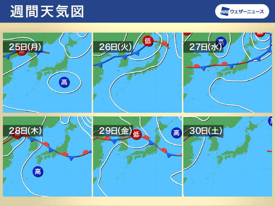 来週中頃になると、低気圧からのびる前線が本州付近まで南下する見込みです。27日(水)は東北南部から山陰付近の日本海側で雨が降りやすくなる予想で、関東など太平洋側でも雨となる可能性があります。