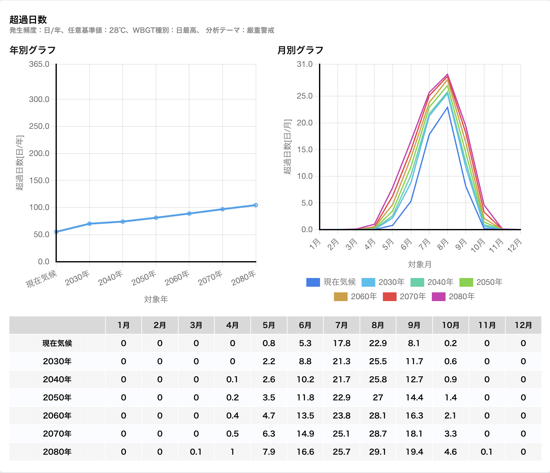 慢性リスク分析「熱中症」では、将来のWBGT予測に対して任意の基準値を設定して、年別や月別に超過する日数を分析することができます。