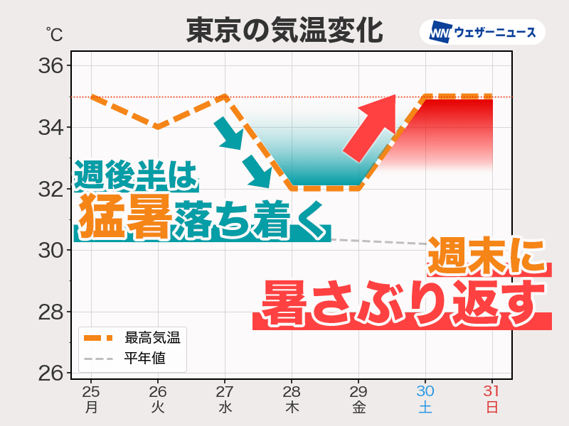 ただ、週末になると太平洋高気圧が再び勢力を強めるため、35℃以上の厳しい暑さがぶり返します。暑さ対策のほか、しっかりと睡眠をとるなどの体調管理を行ってください。