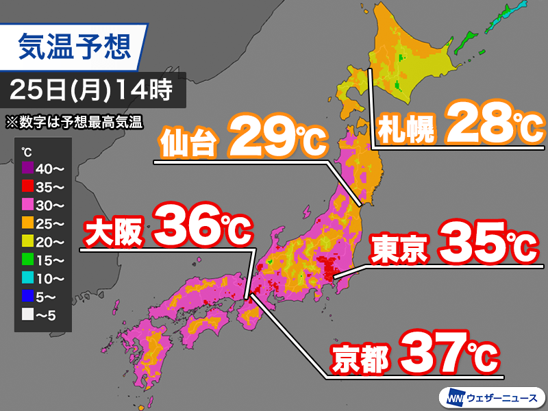 最高気温が35℃以上の猛暑日地点も続出するとみられます。予想最高気温は、東京や名古屋で35℃、横浜や大阪で36℃、京都で37℃です。