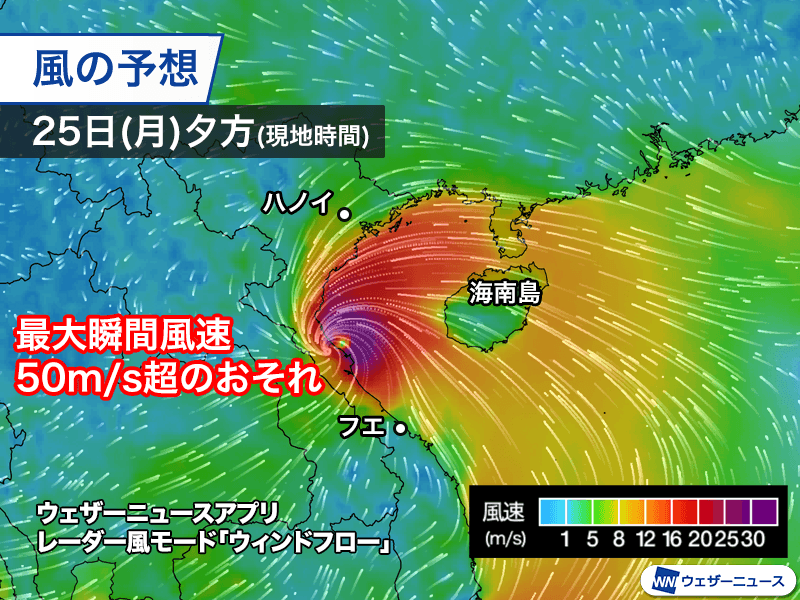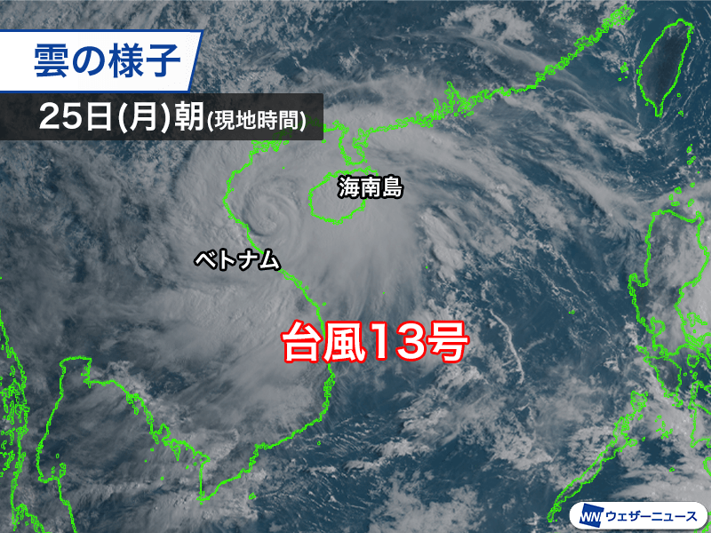 台風13号は現地時間の25日(月)早朝の時点でトンキン湾を西北西に進んでいます。中心付近の最大風速は40m/sで、強い勢力です。すでに台風を取り巻く活発な雨雲はベトナムの北部から中部にかけての沿岸部にかかっていて、局地的に強い雨が降っています。