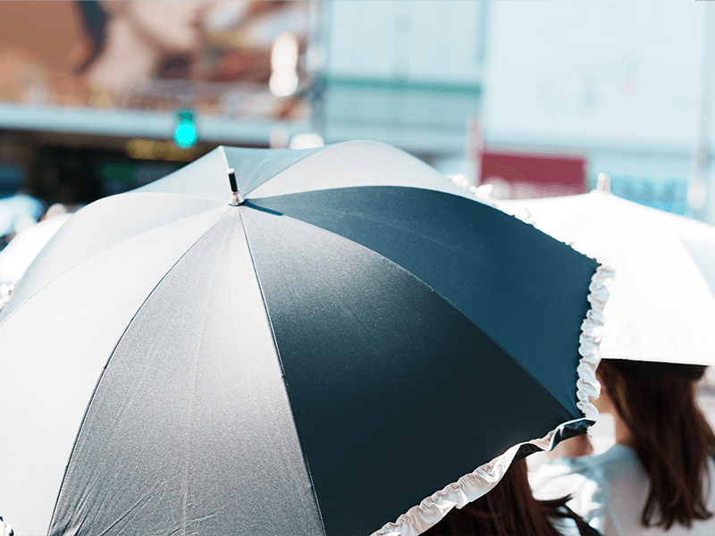 「紫外線は散乱しやすい性質があります。そのため、たとえ紫外線を100%カットできるような素材の傘を使っていたとしても、散乱・反射によって紫外線が横方向の周囲から入ってしまうと言われています。頭や顔への紫外線の侵入を防ぎ、UVカット効果を得るには、傘をなるべく深く差すようにしましょう。