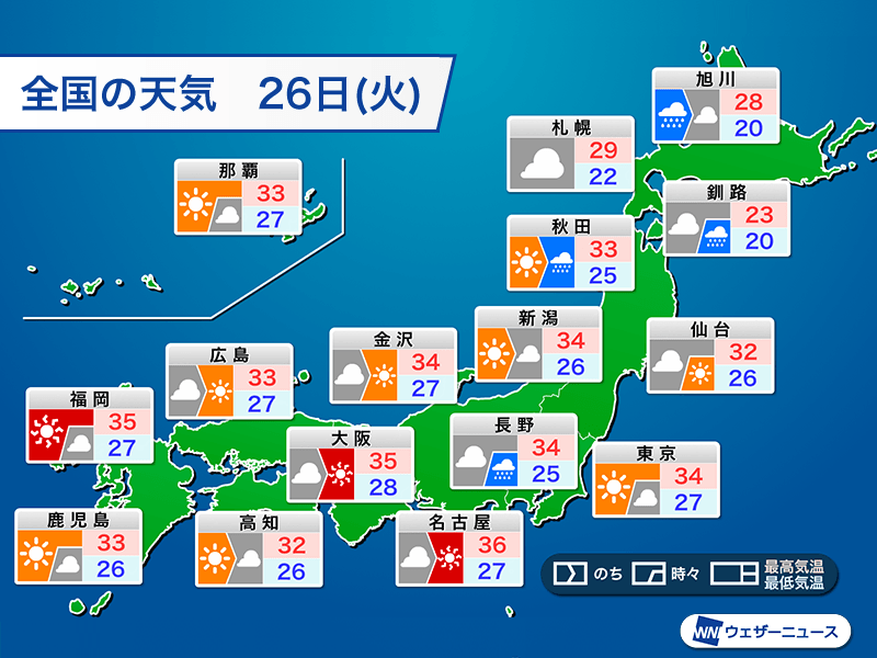 明日26日(火)も西日本、東日本は暑さが続きます。関東は今日に比べると若干低く、東京都心の最高気温は34℃の予想です。連続猛暑日が途切れても厳しい暑さに変わりはありません。